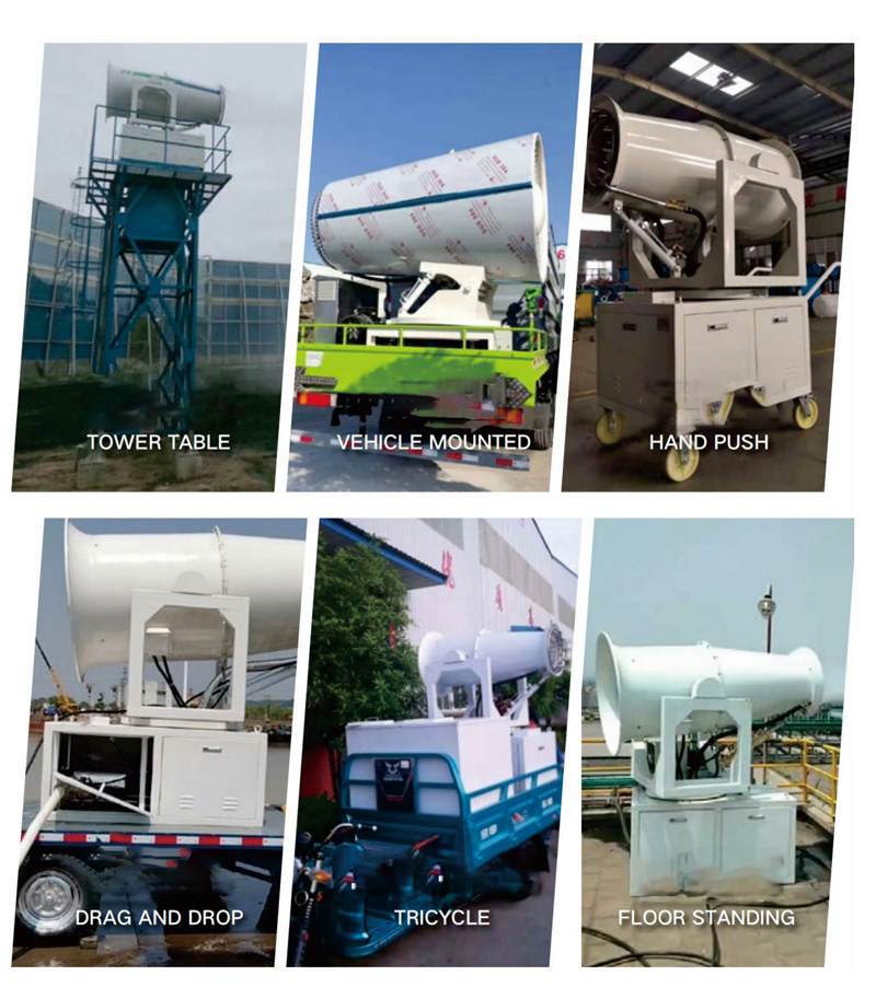 - Long range (20-160 meters), strong penetration, wide coverage, small water mist particles, uniform spraying, fast dust reduction, high efficiency